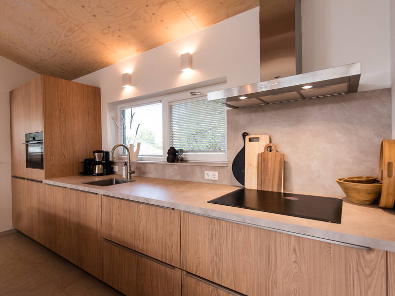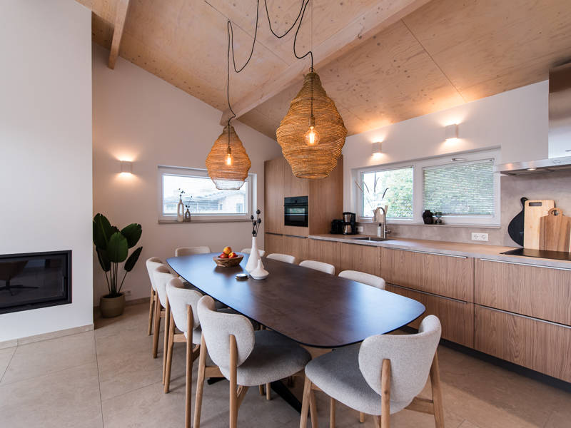 Die offene Küche ist vollständig mit modernen Geräten ausgestattet – ideal, um ein ausgiebiges Abendessen zuzubereiten oder schnell eine Mahlzeit auf den Tisch zu bringen. Der angrenzende Wohnbereich verfügt über eine gemütliche Sitzecke mit Blick in den Garten.