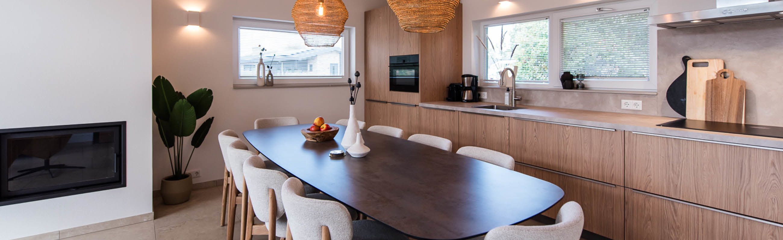 Die offene Küche ist vollständig mit modernen Geräten ausgestattet – ideal, um ein ausgiebiges Abendessen zuzubereiten oder schnell eine Mahlzeit auf den Tisch zu bringen. Der angrenzende Wohnbereich verfügt über eine gemütliche Sitzecke mit Blick in den Garten.