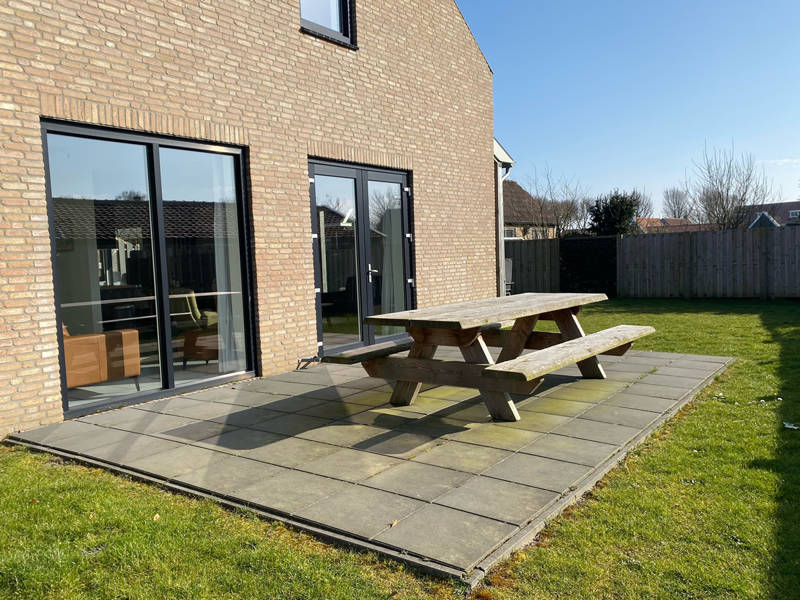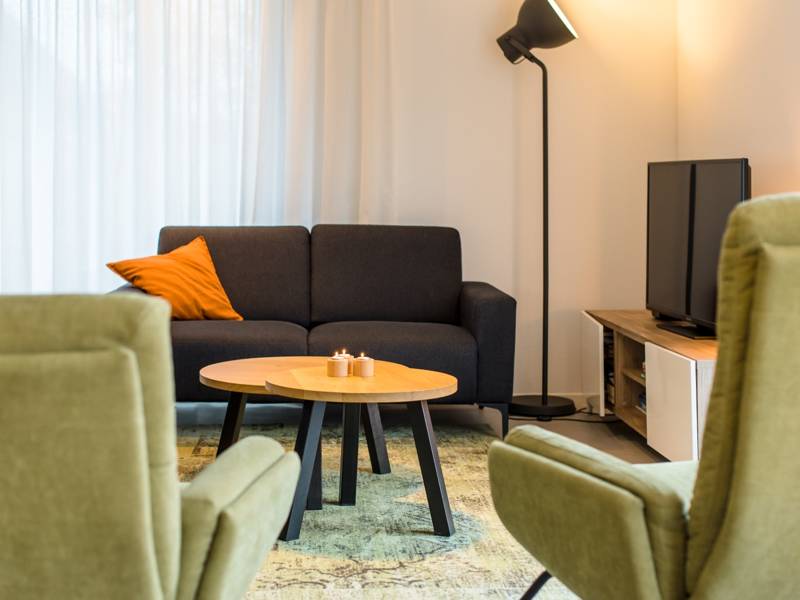 Vom Wohnzimmer aus gibt es Türen zur Terrasse mit Terrassenmöbel und Garten. Bei der Plevieren gibt es einen Parkplatz für 1 Auto pro Wohnung.