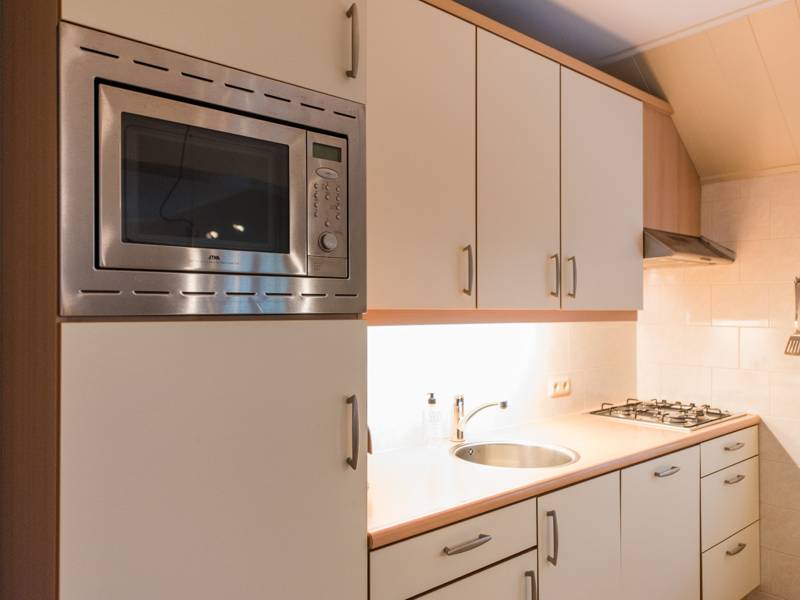 Eigenen Eingang mit Terrasse. Vom Eingangsbereich gehen Sie ins Wohnzimmer mit offener Küche. Die Küche ist voll funktionsfähig und mit allen Geräten ausgestattet; Kühlschrank mit Gefrierfach, Spülmaschine, Kaffeemaschine (Filtertüten), Gasherd und Mikrowellenkombi mit Backfunktion.