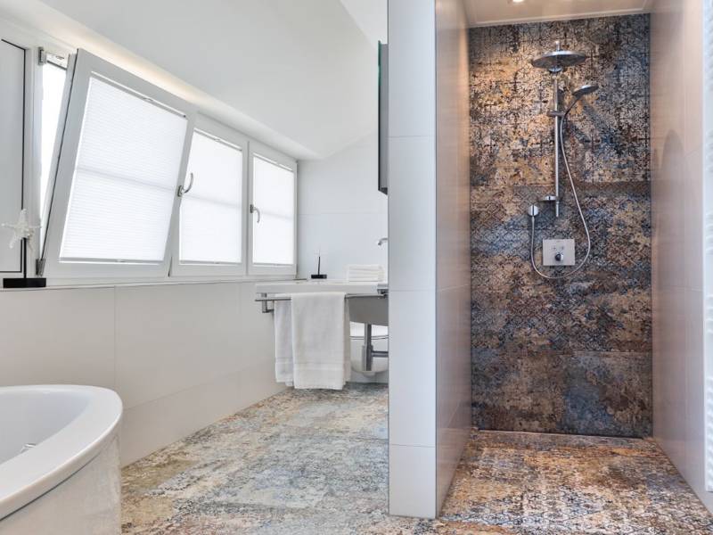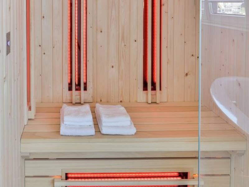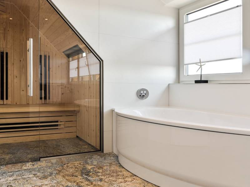 Im Obergeschoss stehen Ihnen 2 stilvolle Badezimmer zur Verfügung. Das größere Badezimmer verfügt über eine begehbare Dusche, eine Badewanne, eine moderne 3 Personen Infrarotsauna, ein großzügiges Waschbecken und eine Toilette. Das andere Badezimmer ist mit einer Dusche mit Sunshower Deluxe ausgestattet, nutzen Sie die IR Wärmestrahlen zum Entspannen nach einer Fahrradtour oder die IV Strahlen zum Vorbräunen, einem Waschbecken und einer Toilette.