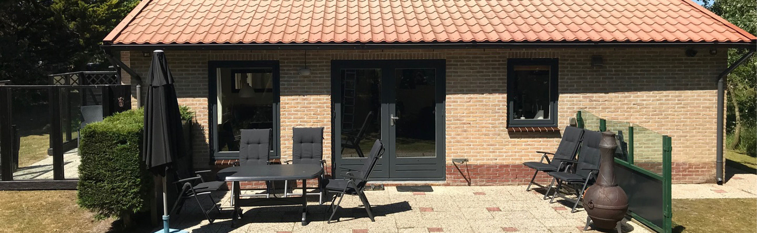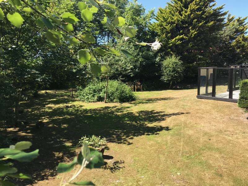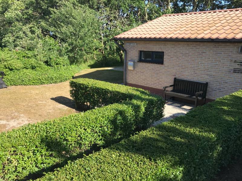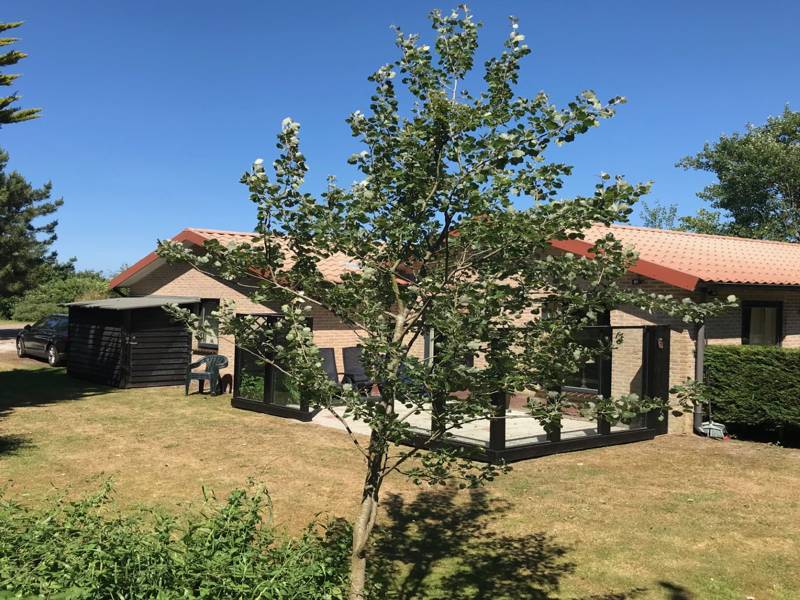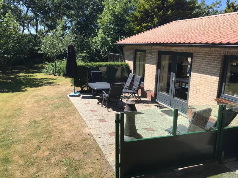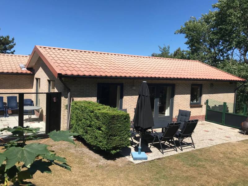 Der Bungalow befindet sich auf einem reichen privaten Grundstück mit einer Süd- und einer Westterrasse, jeweils ausgestattet mit Tisch und Stühlen. Der Garten bietet viel Privatsphäre.